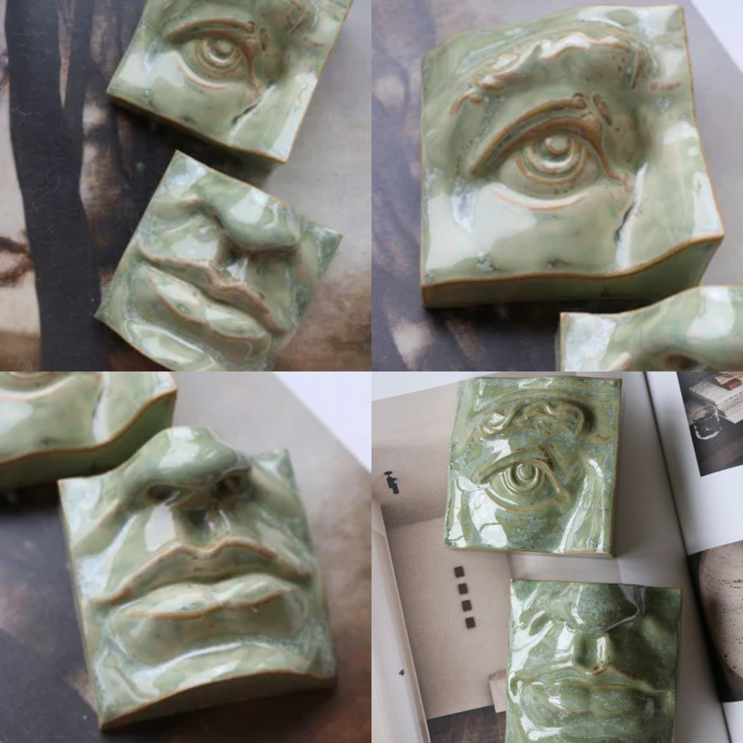2 stk. grønne vægrelieffer (øje og næse/mund). Håndlavet i Århus af skulptør og designer LaoruLaoru. Vægkunsten hænges på et lille søm på væggen.