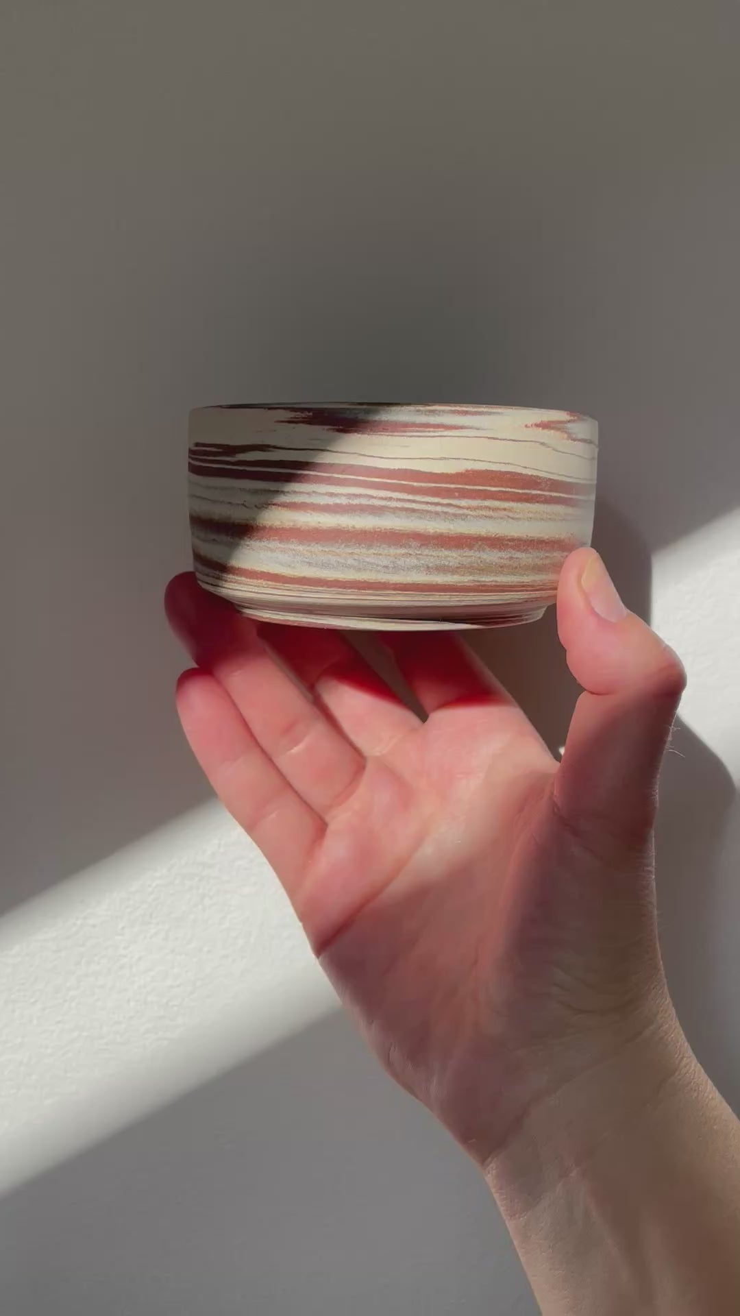 Hver skål og kop har sit helt eget særprægede udtryk med en rå, uglaseret yderside og en mørkebrun glasering indvendigt. Ikke to er helt ens.