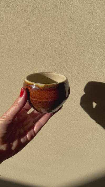 Keramikkoppen har en smuk kantet, geometrisk form. Glaseret med en blank grøn glasur med masser af liv og spil i.
