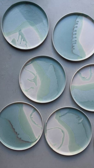 Denne keramiktallerken er fra Vandkant-serien, og den unikke glasur er netop inspireret af vandkanten, både i bevægelserne og i farverne. Alle tallerkener har et unikt mønster, da de er håndglaserede.