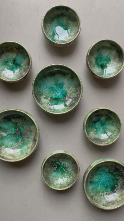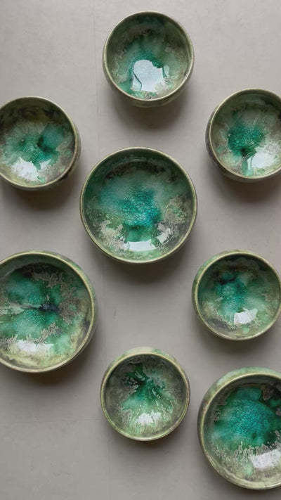 Keramikskål i grønne og lyse nuancer - håndlavet af keramiker Aage Würtz.