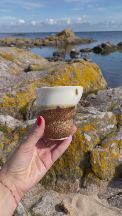 Keramik koppen er formet med kærlighed til håndværket og glaseret med Studio Aarhus' egne, unikke glasurer. Koppen har en smuk organisk form, inspireret af konkylien og er et lille kunstværk i sig selv. Da koppen er håndglaseret, vil mønsteret i glasuren variere fra kop til kop.