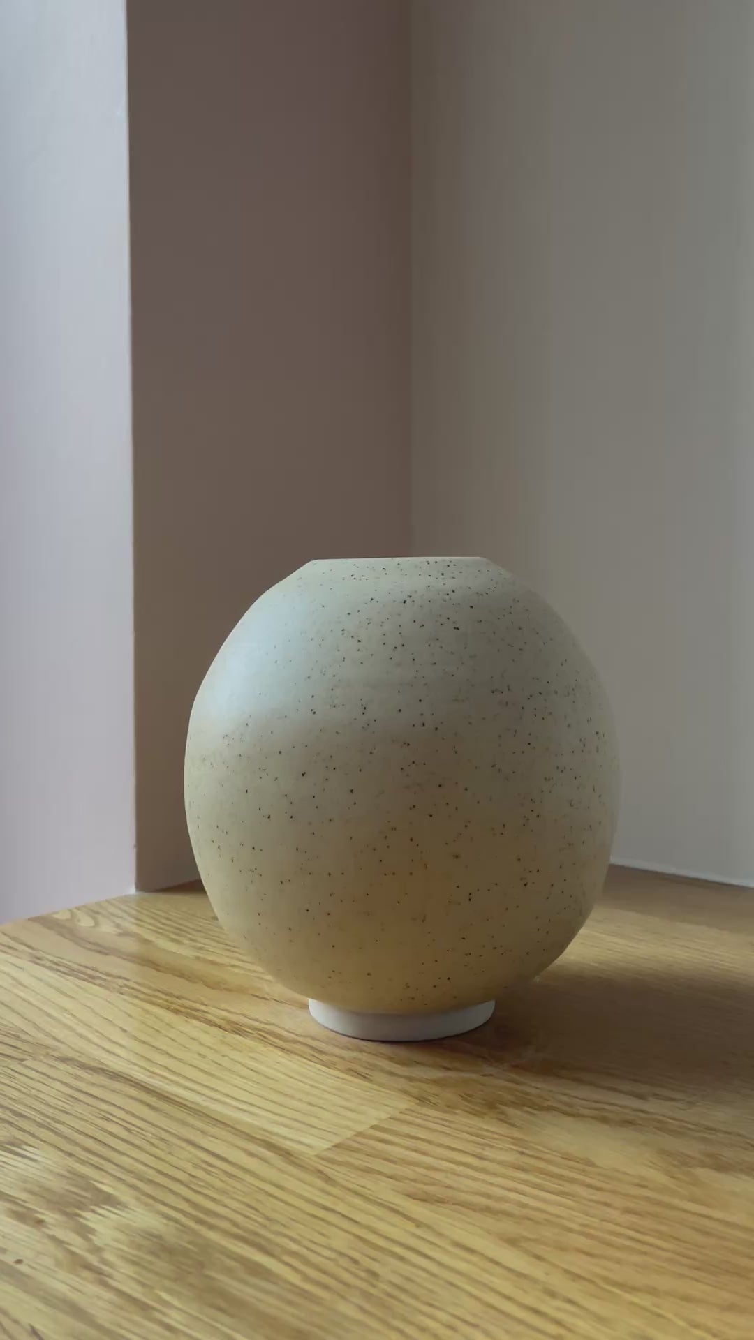 Keramikvasen er hånddrejet og glaseret i hånden. Vasen er kugleformet og står på en lille fod, som tilføjer en elegance til vasen, der blander den feminine og elegante form med en nordisk farveskala.