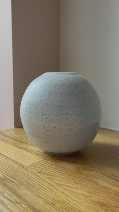 Håndlavet rund unika vase i stentøjsler fra danske TYBO med glasur i ash grey og små prikker.