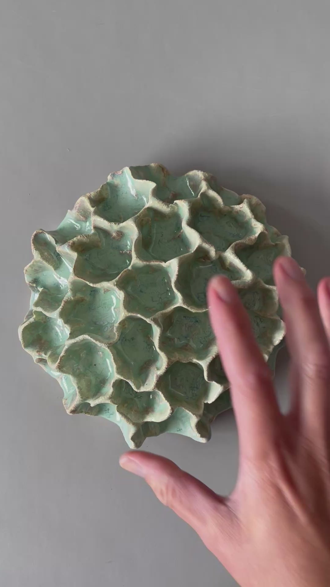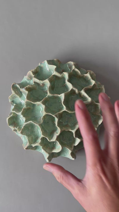 Den smukke skulpturelle koral til væggen fra Clay By Bond har et organisk udtryk med bølgende former og dybe kløfter. Væg korallen er glaseret med blank, grøn glasur med masser af liv, dybde og tekstur på overfladen.