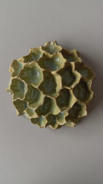 Den smukke, skulpturelle koral til væggen fra Clay By Bond har et organisk udtryk med bølgende former og dybe kløfter. Væg korallen er glaseret med smuk glasur i brun/grønne nuancer, der skaber masser af liv og tekstur på overfladen.