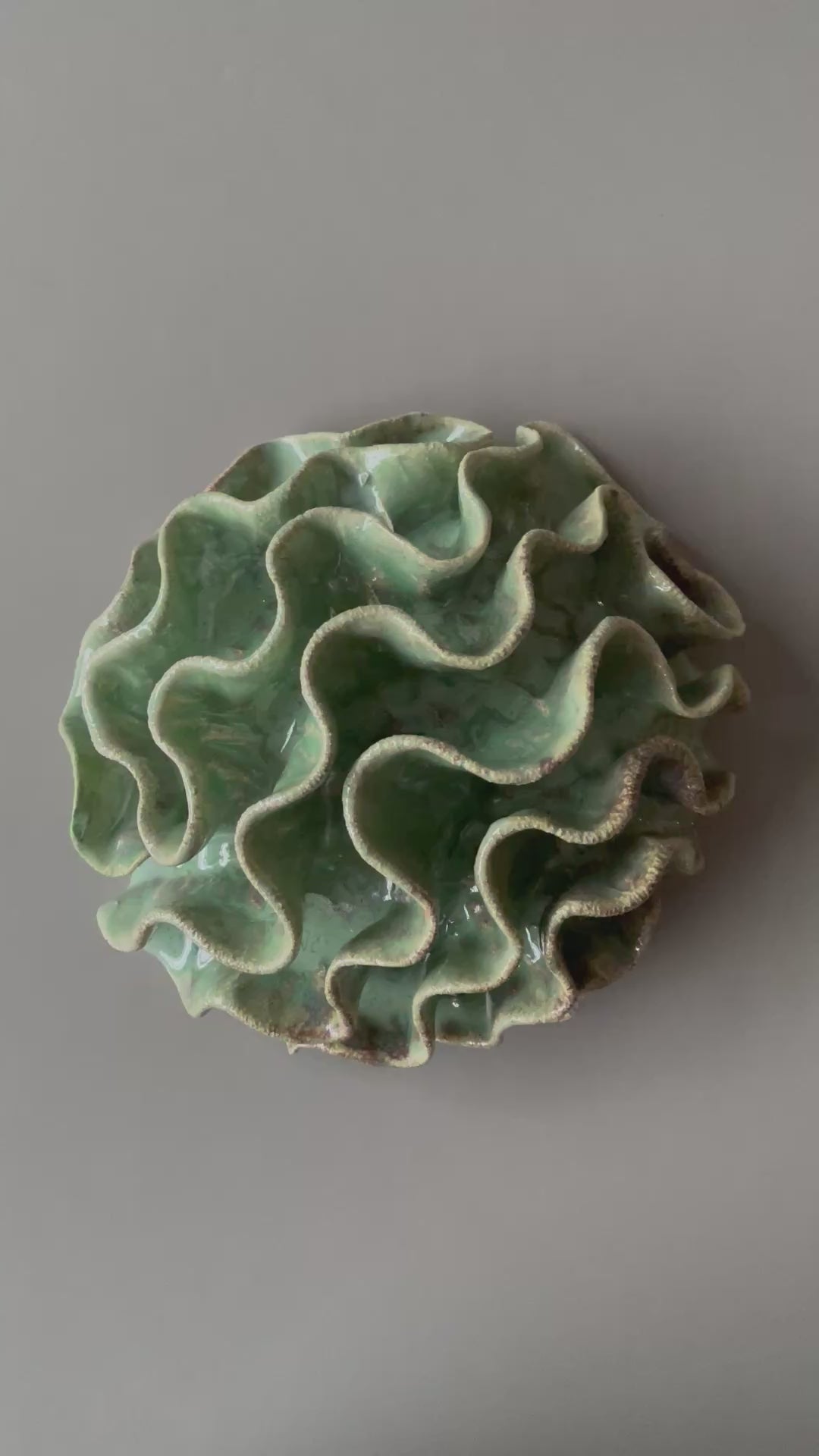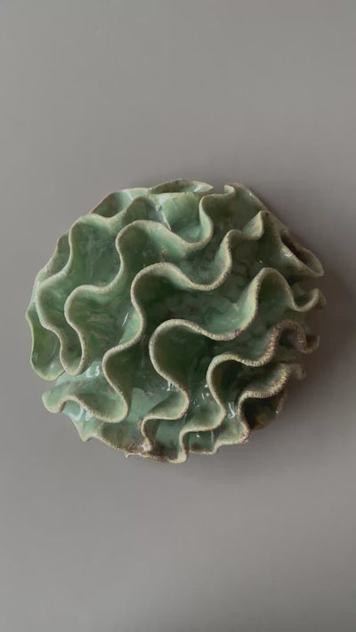 Den smukke skulpturelle koral til væggen fra Clay By Bond har et organisk udtryk med dets bølgende former og dybe riller. Væg korallen er glaseret med en blank, grøn glasur med masser af liv og dybde på overfladen.