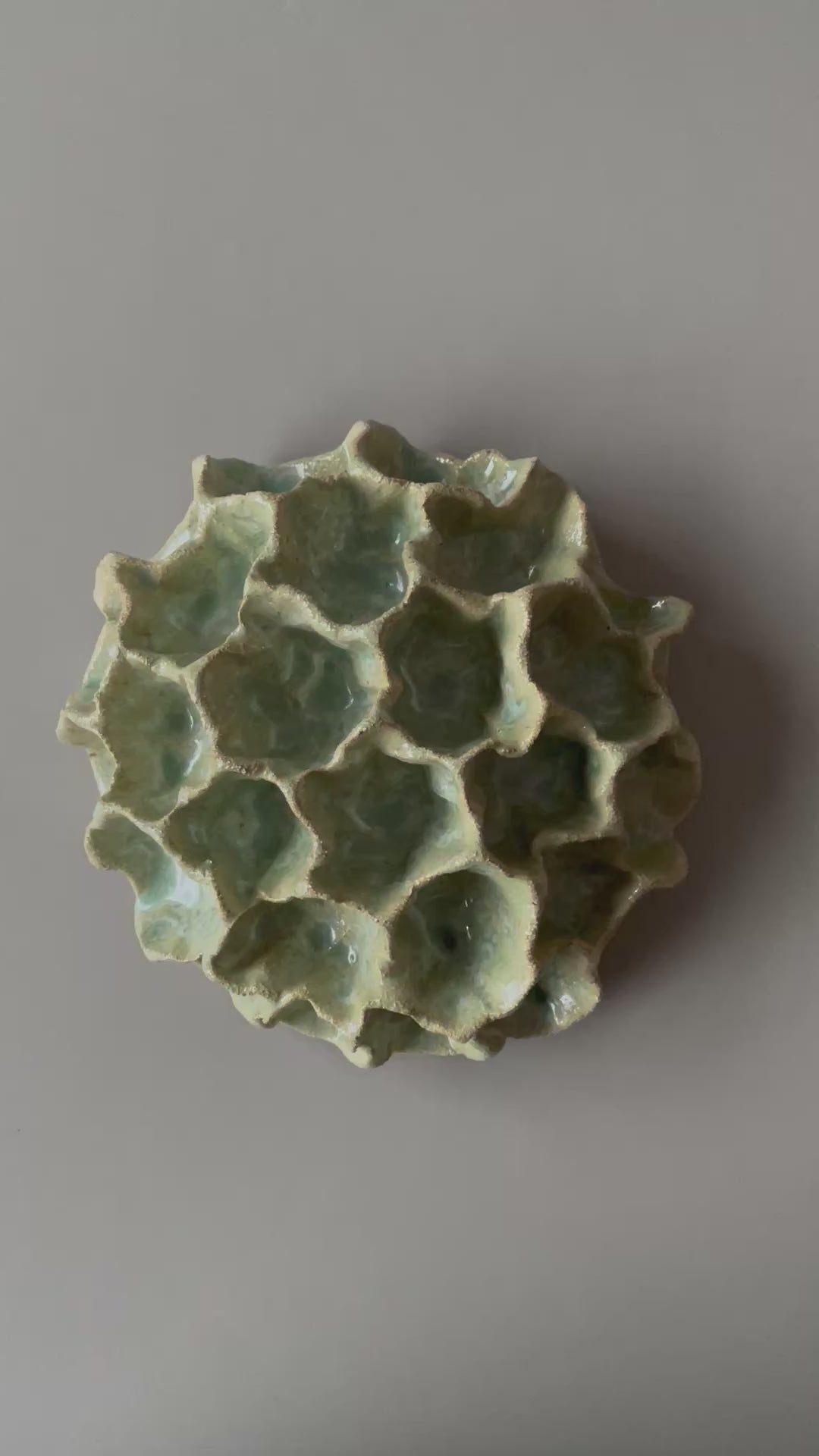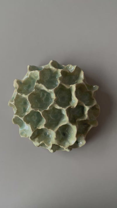Den smukke skulpturelle koral til væggen fra Clay By Bond har et organisk udtryk med bølgende former og dybe kløfter. Væg korallen er glaseret med blank, grøn glasur med masser af liv, dybde og tekstur på overfladen.