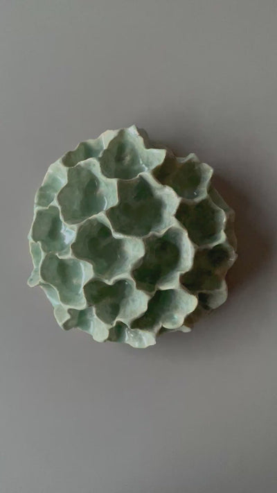 Den smukke skulpturelle koral til væggen fra Clay By Bond har et organisk udtryk med bølgende former og dybe kløfter. Væg korallen er glaseret med blank, grøn glasur med masser af liv, dybde og tekstur på overfladen.
