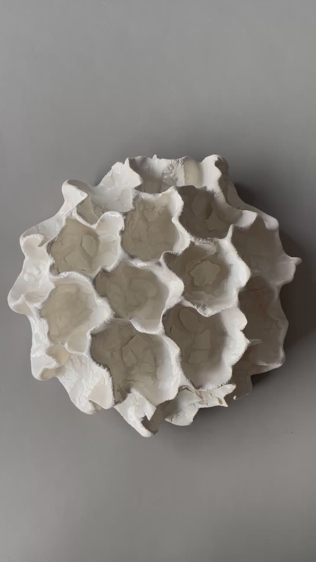 Den smukke skulpturelle koral til væggen fra Clay By Bond har et organisk udtryk med bølgende former og dybe kløfter. Væg korallen er glaseret med blank, hvid kravleglasur med masser af liv, dybde og tekstur på overfladen.